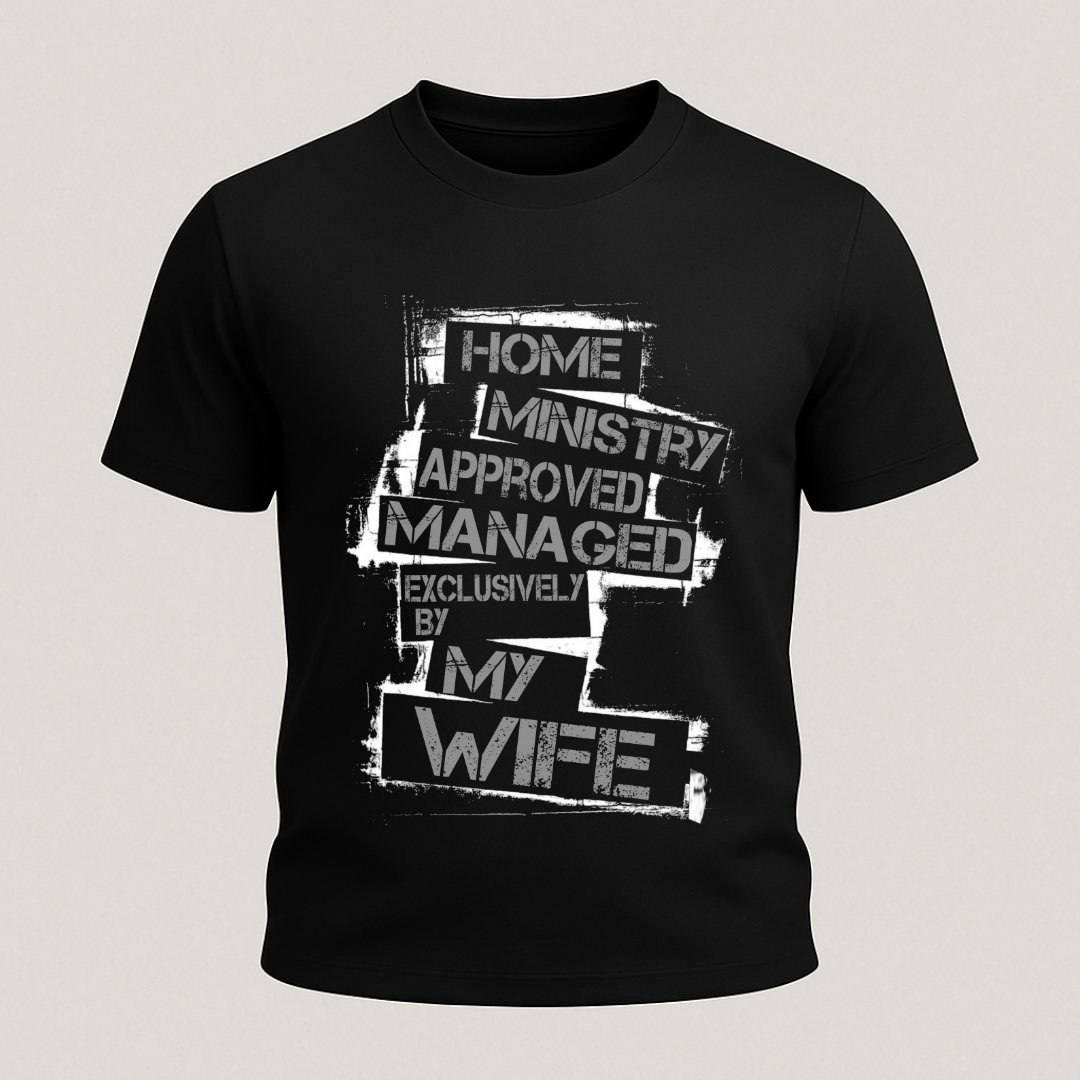 The distressed stencil typography gives off raw attitude, while the message hits like a punchline that every married guy will relate to.