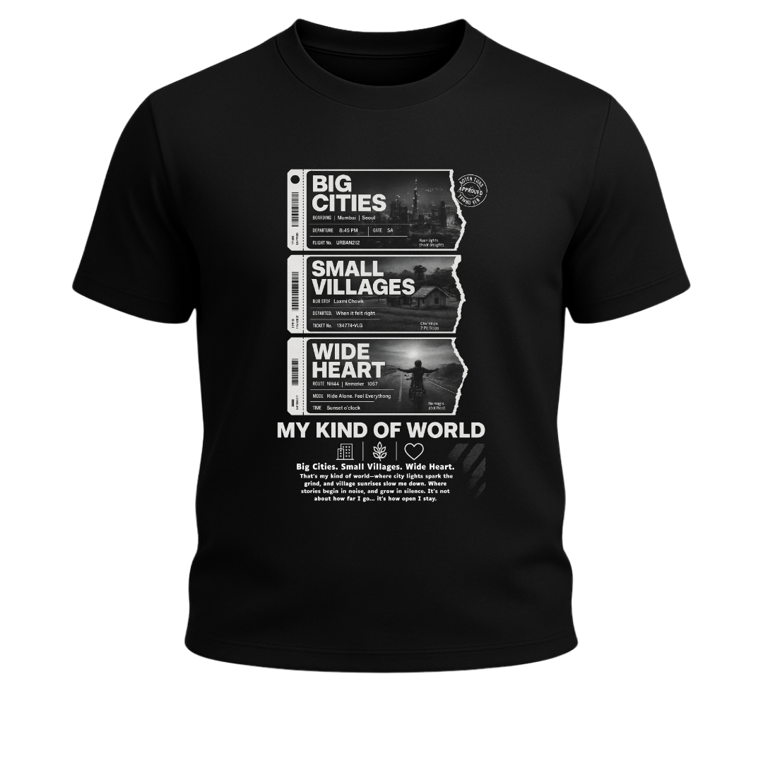 For the wanderer who thrives in chaos and peace alike — this tee blends passports with purpose. Ticket-style visuals celebrate the contrast of towering skylines, quiet corners, and the open-hearted spirit that makes every place feel like home. This isn’t just travel. It’s identity.