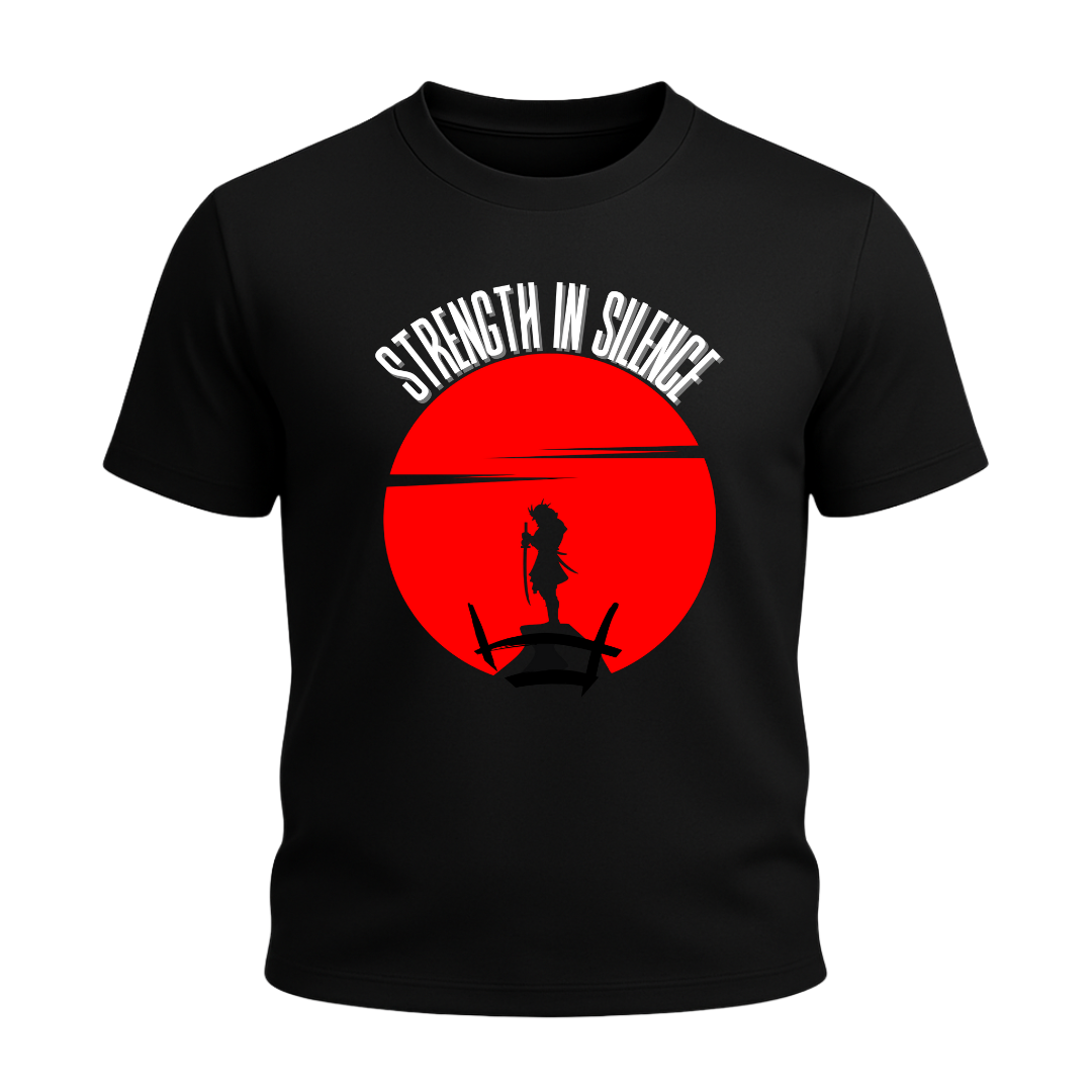 This powerful red sun backdrop with lone samurai silhouette speaks volumes without a word. A tee for warriors who choose calm over chaos, and steel over noise.